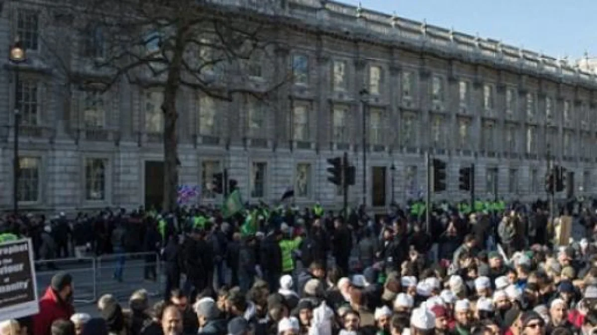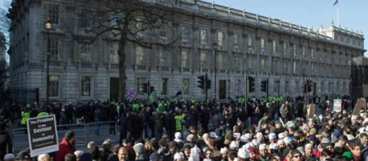 The protesters condemned the attack on the French media outlet, saying that anyone who kills to avenge is violating Islamic law. Still, they maintained that the magazine should refrain from publishing blasphemous content about the prophet. Religious leaders from the community delivered speeches before the crowd prayed together. Before dispersing, the protesters handed in an online petition to Cameron's office. It was signed by more than 100,000 Muslims from across the country.