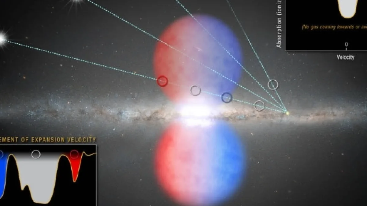 They used this light to deduce the composition, speed and temperature of the gas within the enlarging bubble, resulting in a temperature of nearly 17,700° F. The elements silicon and carbon-two elements found in almost every galaxy and representing the remnants of stellar evolution, were detected inside the gaseous cloud. The cool gas was estimated to be travelling at 2 million miles/h, revealing an estimated age 6-9 million years for the bubbles.