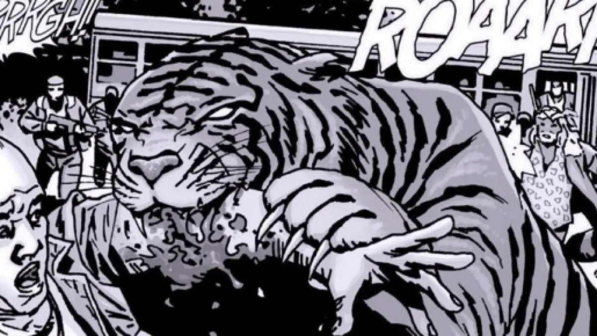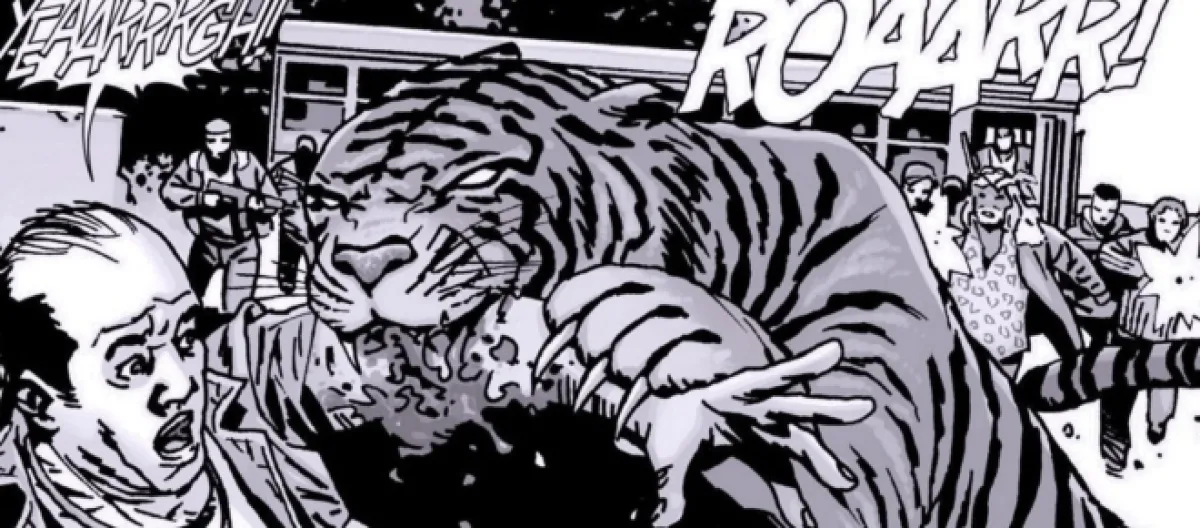 According to the director of the episode, Shiva was all animatronics, and CGI was used to create Shiva´s facial expressions and body movements from the head to the tail, including the colors. The experience that director Greg Nicotero had in animatronics allowed him and his staff to design the character. In Ezekiel´s kingdom, Shiva the tiger won´t eat humans but captivate the eye of the spectator.