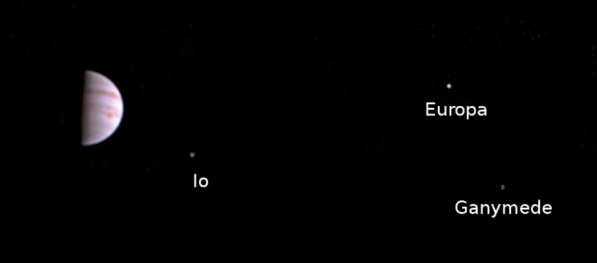 The first photo of the Jupiter´s system was taken on July 10, when Juno had travelled a distance and was at approximately 4.3 million km (2.7 million miles) from the gas giant on its first of two 53.5 days orbit around the giant planet. This first image portrays one vertical half of Jupiter, showing its Great Red Spot and other light dark gas bands. To its left, Jupiter´s largest moons-from left to right-Io, Ganymede and Europa, are appreciated.
